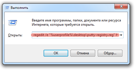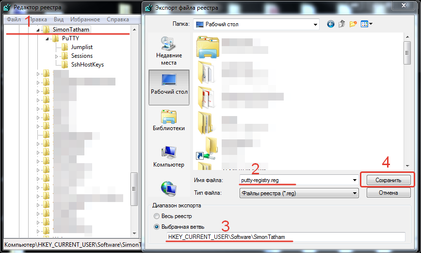 Второй способ не сложнее необходимо ввести команду в окне Выполнить. Для этого необходимо нажать на клавиатуре Win+R и в поле Выполнить ввести команду regedit /e "%userprofile%\desktop\putty-registry.reg" HKEY_CURRENT_USER\Software\Simontatham, где ключ /e означает экспорт ветки реестра, %userprofile%\desktop\putty-registry.reg место сохранения и имя фала реестра, HKEY_CURRENT_USER\Software\Simontatham экспортируемая ветка реестра.