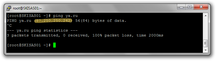 Как видно мы пытались запустить ping до сайта ya.ru и проверка DNS удалась, так как DNS разрешил имя ya.ru и в ответ выдал нам ip-адрес закрепленный за доменным именем (87.250.250.242). Но так же в этом частном случае мы можем наблюдать, что передано 3 пакета данных из них получено 0, и 100% пакетов утеряно. Мы пробовали отправлять пакеты из внутренней локальной сети в сторону сети интернет, при том DNS работает, делаем вывод, что у нас проблема с шлюзом или же для нашей сети недоступен интернет через шлюз.
